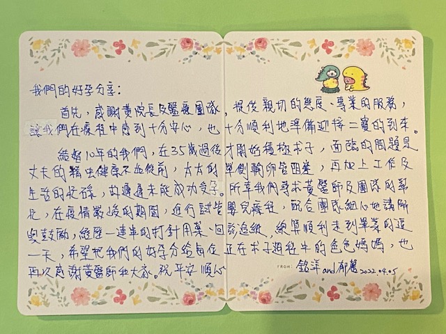 結婚10年的我們,在35歲過後才開始積極求子,面臨的問題是丈夫的精蟲健康不如從前,太太的單側輸卵管阻塞,在加上工作及生活的忙碌,故遲遲未能成功受孕。所幸我們尋求黃醫師及團隊的幫忙,在疫情嚴峻的期間進行試管嬰兒療程,配合團隊細心地講解與鼓勵,經歷一連串的打針用藥、回診追蹤,總算順利走到畢業的這一天,希望把我們的好孕分給每位正在求子過程中的爸爸媽媽,也再次感謝黃醫師和大家。祝平安順心