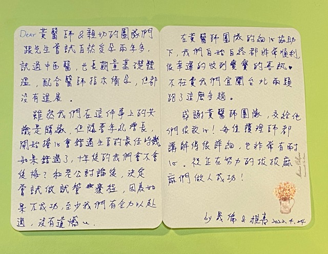 在黃醫師團隊的細心協助下,我們自始自終都非常順利,很幸運的收到寶寶的喜訊,不枉費我們宜蘭台北兩頭跑了這麼多趟。