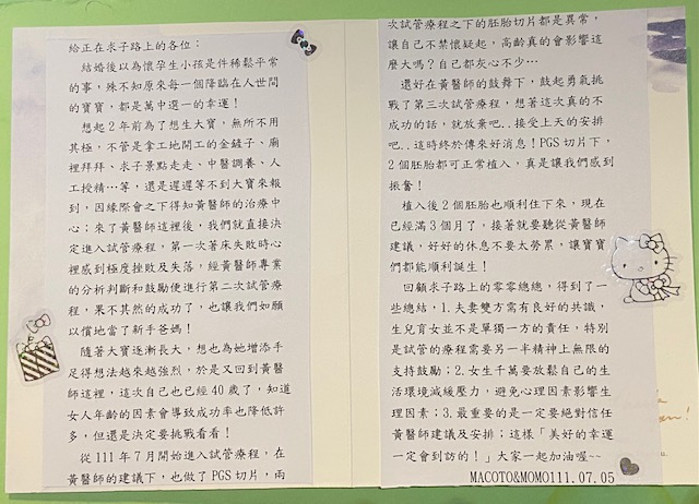 隨著大寶逐漸長大,想也為她增添手足得想法越來越強烈,於是又回到黄醫師這裡,這次自己也已經40歲了,知道女人年龄的因素會導致成功率也降低許多,但還是決定要挑戰看看!從110年7月開始谁入試管疼程,在黃醫師的建議下,也做了PGS 切片,兩次試管療程之下的胚胎切片都是異常,自己不禁懷疑起,高龄真的會影響這麼大嗎?自己都灰心不少,還好在黃醫師的鼓舞,鼓起勇氣挑戰了第三次試管療程,想著這次真的不成功的話,就放棄吧,接受上天的安排吧….這時終於傳來好消息!PGS切片下2個胚胎都可正常植入,真是讓我們感到振奮!植入後2個胚胎也順利住下來,現在已經滿3個月了,接著就要聽從黃醫師建議,好好的休息不要太勞累,讓寶寶們都能順利誕生!