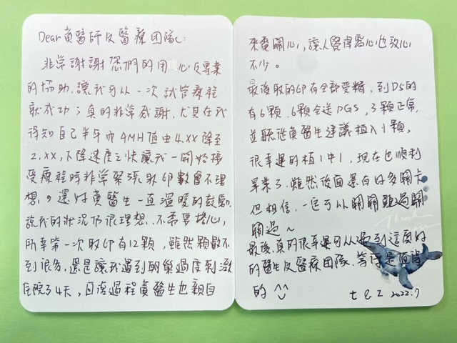 非常謝謝你們的用心及專業的協助,讓我可以一次試管療程就成功。
