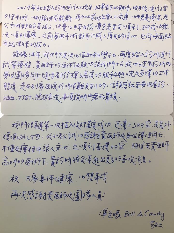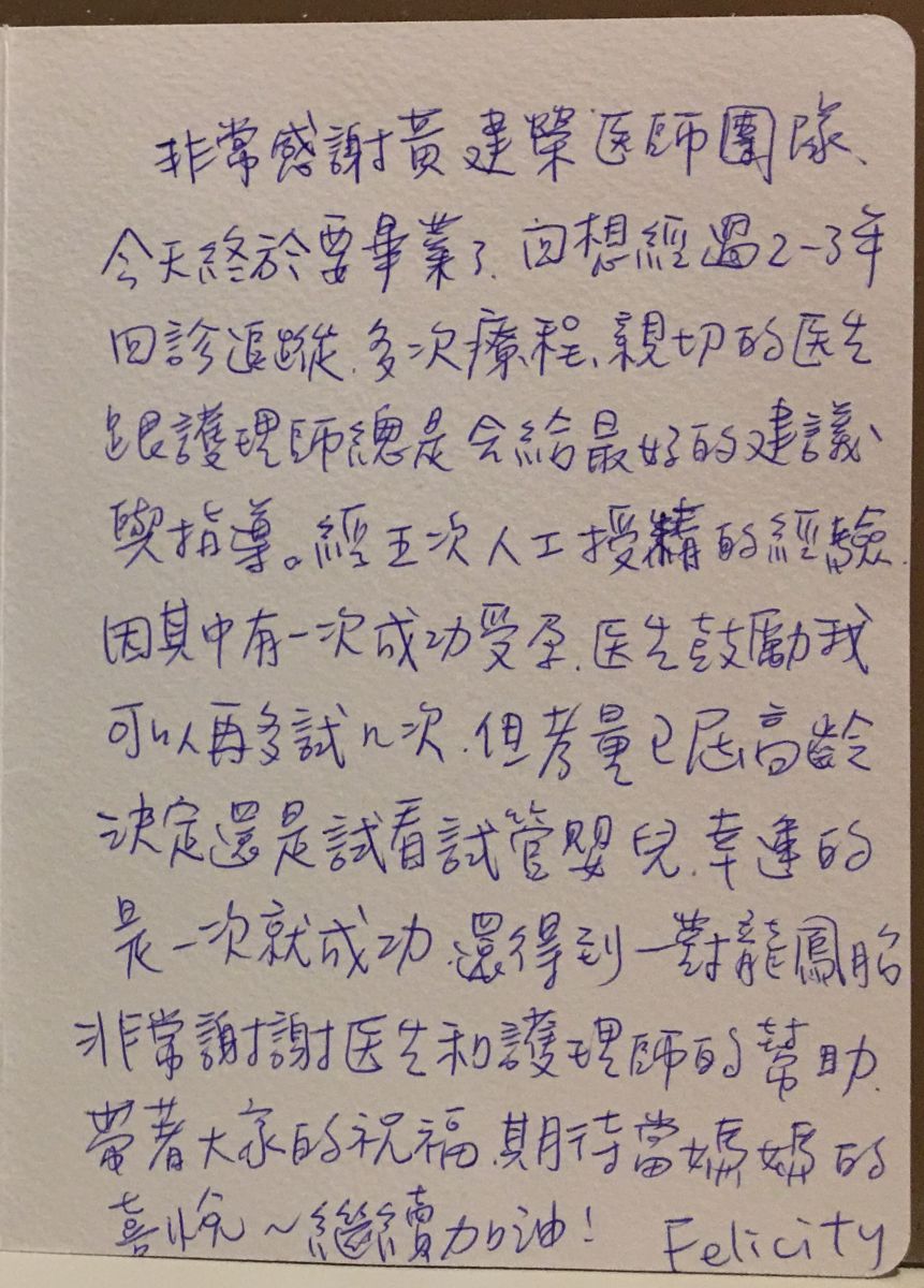 非常感謝黃建榮醫師團隊今天終於要畢業了,回想經過2~3年回診追蹤多次療程,親切的醫生跟護理師總是會給最好的建議與指導。經過五次人工授精的經驗,因其中有一次成功受孕,醫生鼓勵我可以再多試幾次。但考量已屆高齡決定還是試看看試管嬰兒,幸運的試一次就成功還得到一對龍鳳胎。非常謝謝醫生和護理師的幫助。