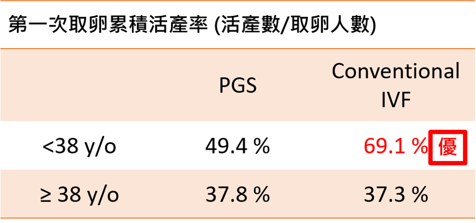 這篇論文分析到這裡看起來PGS對於年輕、小於38歲,或者高齡大於38歲的婦女,從一次取卵的累積懷孕率角度來看,是沒有幫忙的。