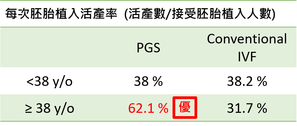 38歲以下的婦女,有接受PGS治療以及沒有接受PGS的治療,這兩組病人每次胚胎植入的活產率是相同的。
