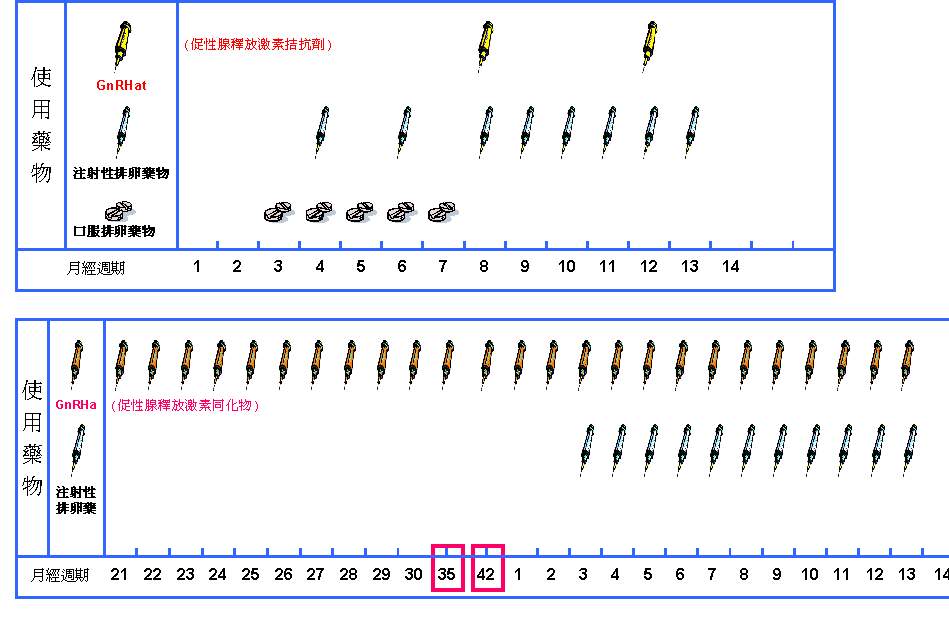 目前全世界進行試管嬰兒治療最流行的誘導排卵方法是結合二類藥物促性腺釋放激素同化物(GnRH agonist);注射型排卵藥的長期使用。該方法前者(促性腺釋放激素同化物)須連續20至30天打針,後者(排卵藥)需注射8至12天不等。該方法的最大優點是可以避免卵子提早黃體化而導致無法取卵或降低懷孕率(占30%的治療病患),但打針天數長、針劑用藥量大是其最大缺點。