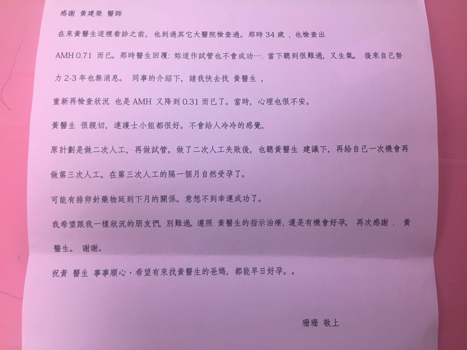 這是條長達五年漫長又辛苦的求子之路,很謝謝黃醫師的團隊讓我在第三次試管後成功生下寶寶。在還沒遇到黃醫師前,就已經在外經歷3次人工3次試管失敗,當初幾乎是抱著萬念俱灰的心情找上黃醫師,還好遇到了他們專業又親切的團隊,讓我再度找回信心與勇氣,原本AMH值只有1.06後來居然降到只剩0.11,想想當初不斷的努力又失敗,早已經沒什麼信心,甚至於等待開獎的2週肚子悶悶,心想跟前幾次失敗感覺一樣,這次大概又希望落空了吧⋯原本連抽血都懶得回去,經由先生勸說才回診抽血驗孕,當天下午電話響了,其實我早已把對方的台詞都預設好了,大概就是失敗繼續努力⋯諸如此類的話吧!沒想到電話那頭居然是說:恭喜你懷孕了!很白癡的我還回對方:真的嗎?你有沒有打錯?我是XXX耶~就這樣我成功的在試管之路畢業了!終於能體會黃醫師一直強調的重質不重量,但相信很多人跟我一樣困在數據裡憂傷,其實相信黃醫師就對了,只要努力不放棄一定能成功的⋯而如今我也準備要生二寶,產後8個月的我居然自然懷孕了!所以做試管的媽咪也是會自然懷孕的,不要放棄任何機會與希望,想跟所有還在努力的媽媽說:「你們辛苦了!」希望我的故事能給大家一點信心,像我指數那麼差都能成功懷孕,你們一定也可以的~加油!最後⋯真的很感謝黃醫師的團隊,你們的專業和細心讓我們這個家更圓滿。